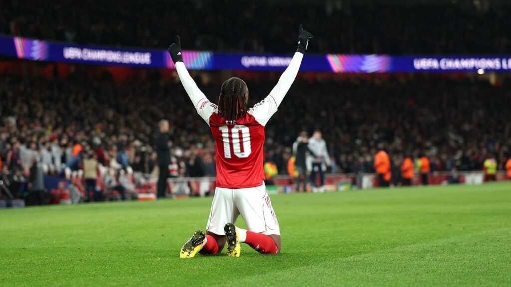 Selebrasi gelandang Arsenal, Eberechi Eze usai mencetak gol ke gawang Bayer Leverkusen pada leg kedua 16 besar Liga Champions, 18 Maret 2026. (c) AP Photo/Ian Walton